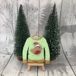 Wooden hanging Christmas jumper decoration measuring 12.5cm, painted & decorated by hand. Comes hung with twine.